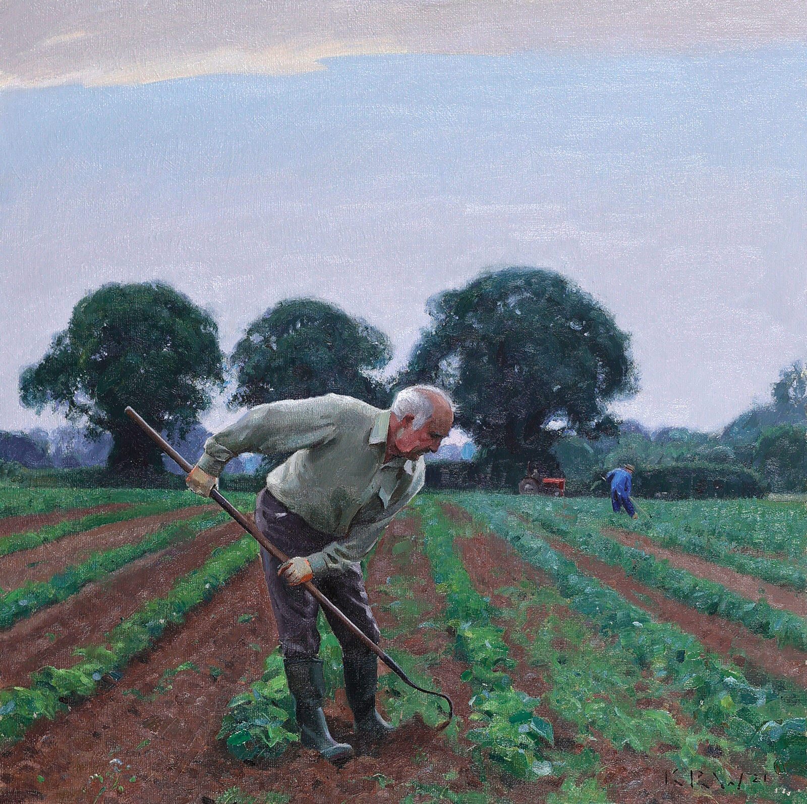 “A lovely scene, not something you see every day. While I was picking strawberries last summer at Jones of Antingham, I saw two old farm hands hoeing weeds in the adjacent field. Two great characters, it was a joy painting this.”